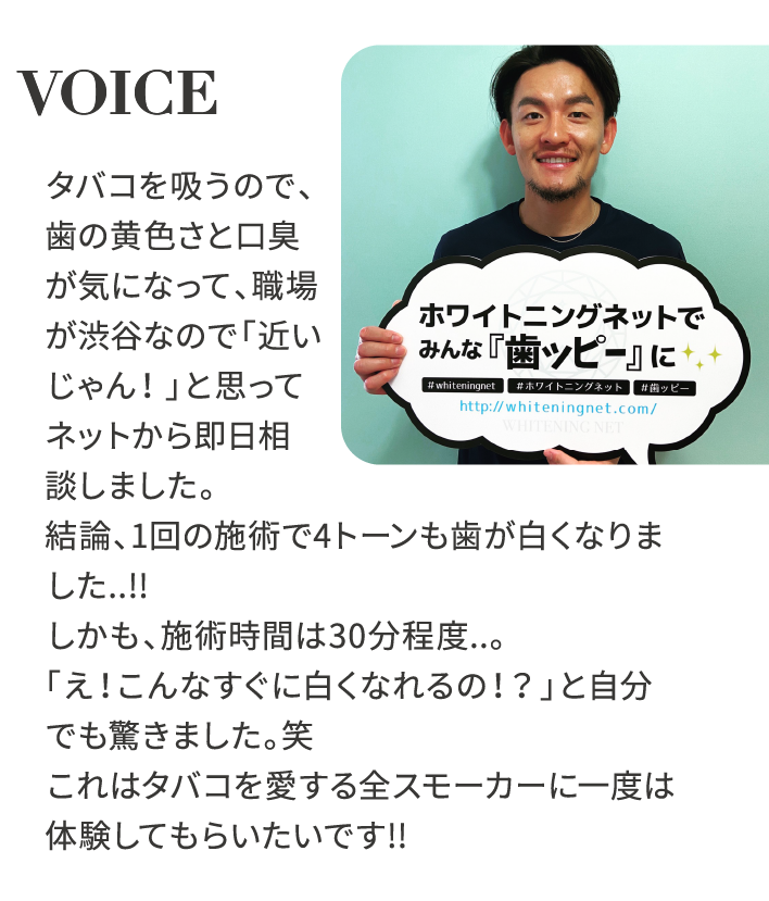 特に大きなリスクや副作用は今まで報告されていません。ただ施術箇所に虫歯や細かいひび割れなどがある場合などに知覚過敏のような痛みが生じることがありますが、通常は1〜2時間以内に、長くとも24時間以内にはおさまります。